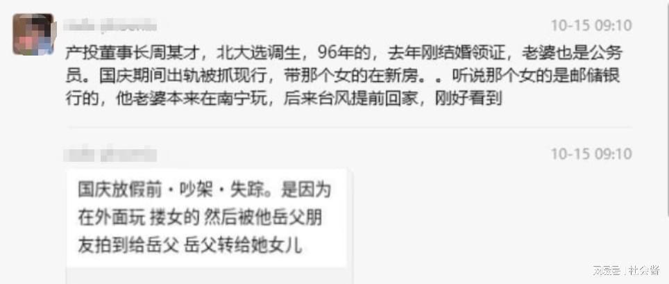 据知情人士透露,国庆假期期间,周某财的妻子原本在南宁游玩,却因遭遇台风且需参加高院集训而提前返回。有说法称,妻子回家后直接发现了小三;也有说法称,妻子是通过家中的监控发现了这一不齿之事。无论哪种说法,都足以证明周某财的出轨行为已被妻子当场揭穿。