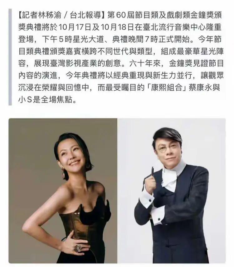 回顾小S和蔡康永的合作历程,不得不提2004年的经典综艺节目《康熙来了》。这个节目曾经是无数人的下饭菜神综,陪伴了大家无数个欢乐的时光。如今,“康熙结合”再次出现在金钟奖的舞台上,各大网站瞬间炸开。原来有些人的“死灰复燃”,真的能治愈整个娱乐圈。