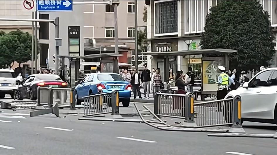 更令人揪心的是,越野车在撞毁出租车后仍未停下,继续冲撞路中隔离栏,撞开数截护栏后驶入对向车道。最终,6辆轿车、1辆电动车和1名行人遭殃。