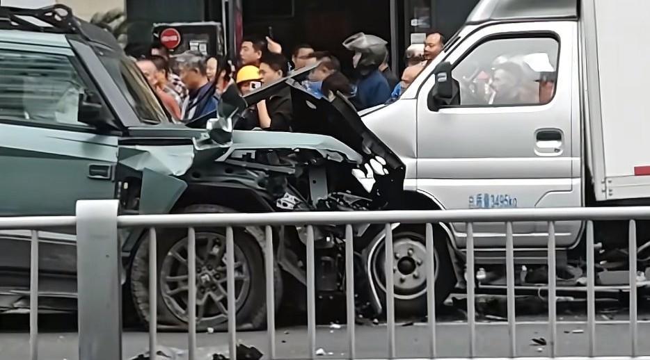 在行人惊呼声中,越野车直接撞向前方一辆绿色出租车。撞击力度之大,导致出租车前引擎盖被掀开,车头严重变形。从车辆损毁程度判断,车内人员受伤严重。