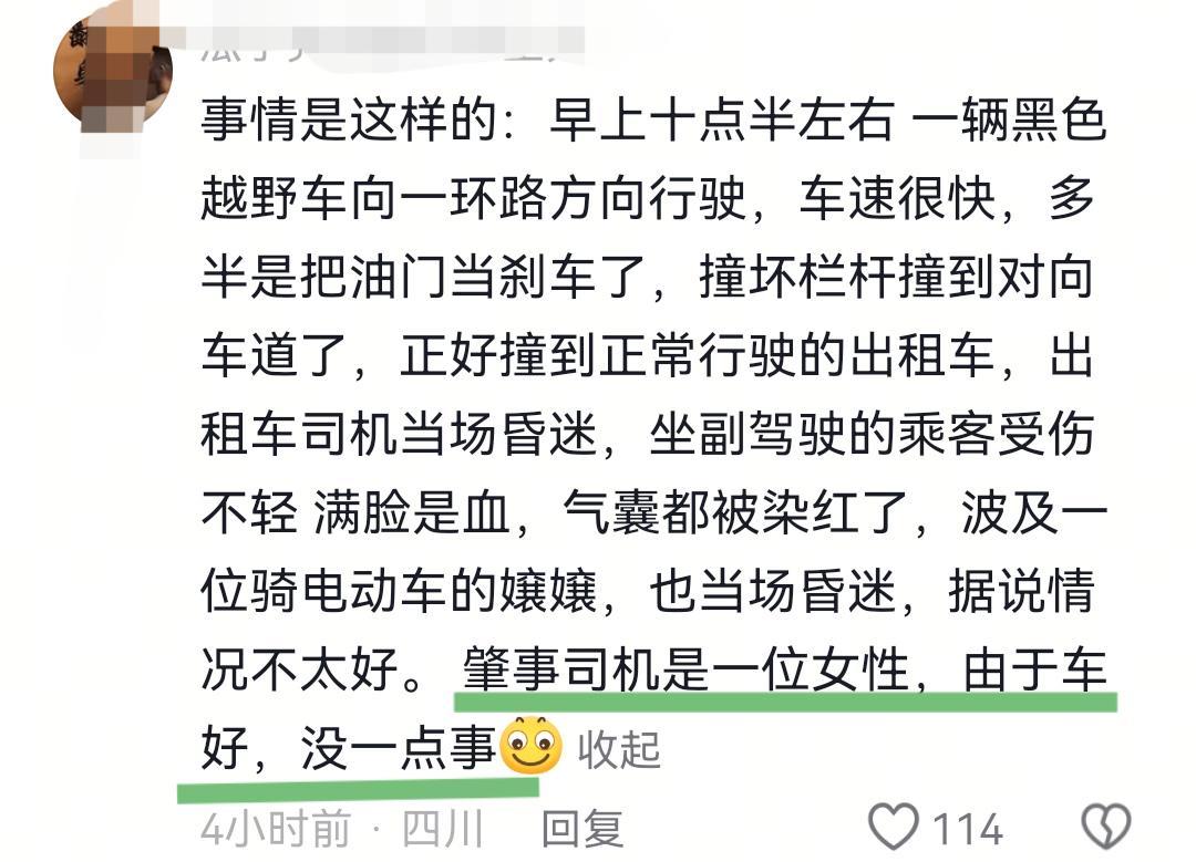 目击者称,被撞出租车司机和乘客、骑电动车的大妈伤势较重。而肇事女司机因车辆性能较好,未受任何伤害。