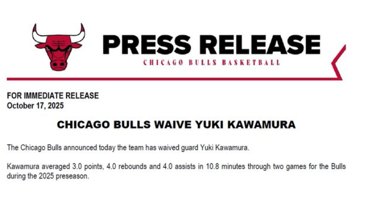 北京时间10月18日,芝加哥公牛队官方正式宣布,球队已裁掉日本后卫河村勇辉。这位身高1米70的控球后卫因右小腿持续疼痛,未能出战公牛队季前赛最后三场比赛,如今需另寻NBA发展机会。