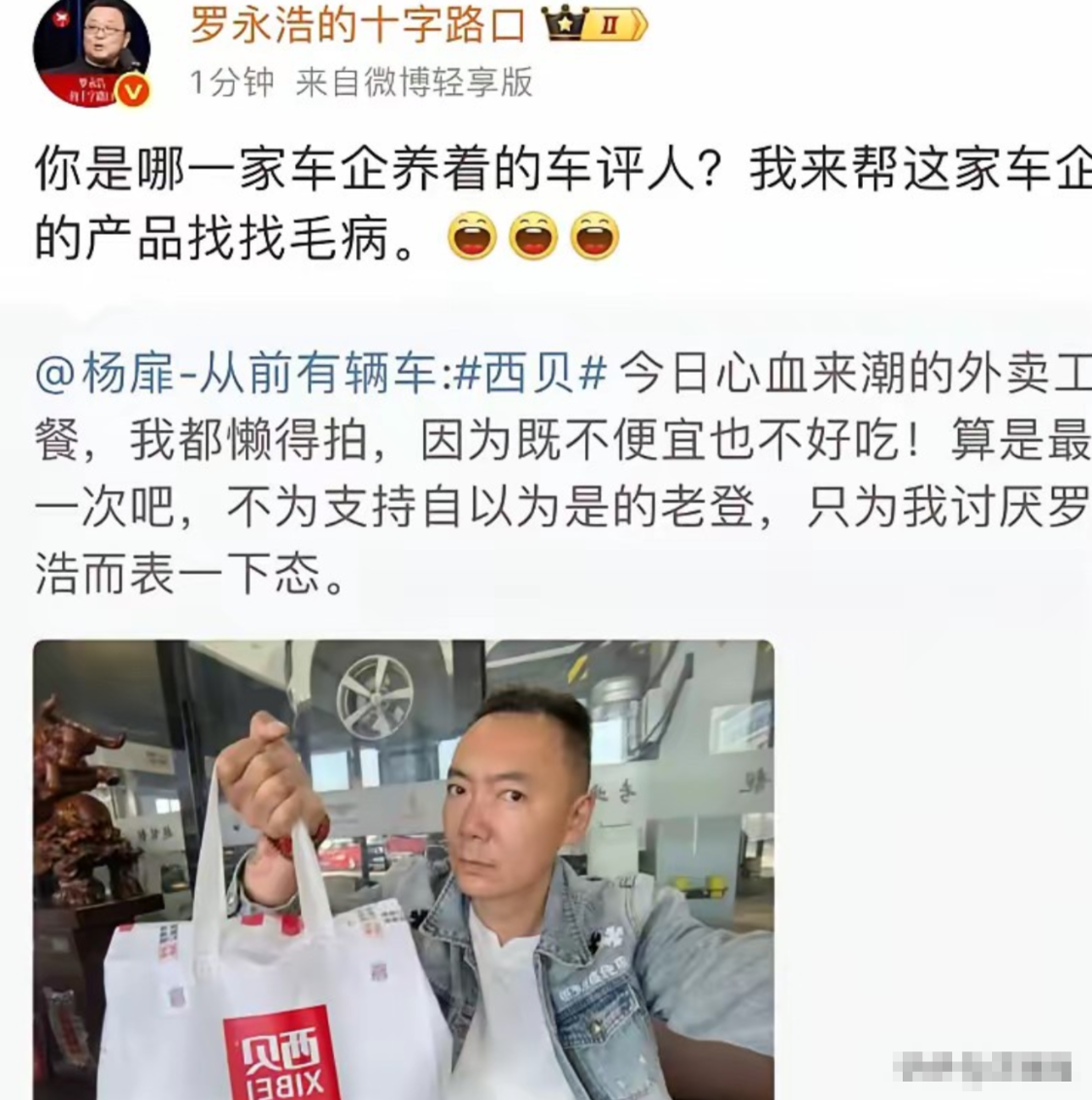 他自己都说了,根本不爱吃西贝,纯粹就是因为讨厌罗永浩,才硬着头皮下单的。这是什么小学生级别的赌气操作?为了跟人置气,连自己的胃都不顾了,怕不是车评圈卷不动了,想靠“奇葩人设”出圈?