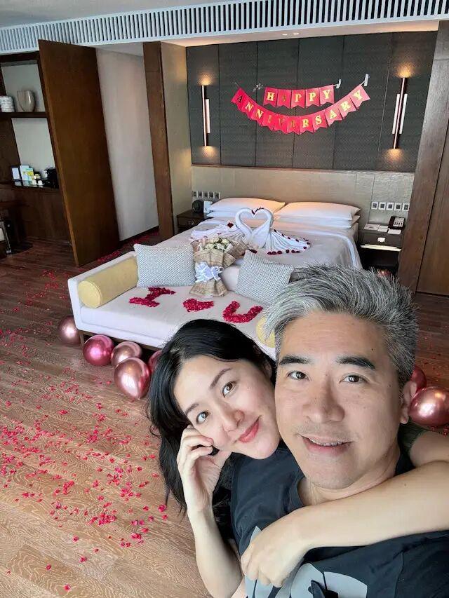 从钟溥敏分享的照片中,我们可以看到徐俊文为妻子精心准备了极致浪漫的奢华Villa,以享受二人世界。他们的酒店房间内,超大床铺上铺满了玫瑰花瓣,并巧妙地砌出了“I love you”的字样,床头更是以花瓣拼出了“Happy Anniversary”的温馨祝福。