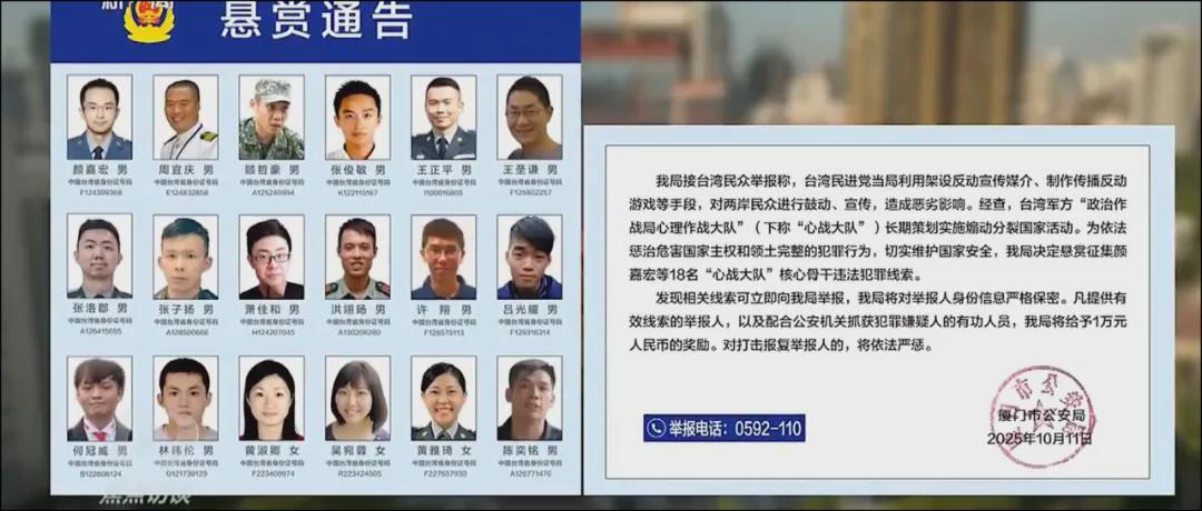 众所周知,在几天前的10月12日,福建省厦门市公安局发布了一则引人注目的悬赏通告,该通告明确征集颜嘉宏等18名台湾军方‘政治作战局心理作战大队’(以下简称‘心战大队’)核心骨干的违法犯罪线索,这一举动立即在社会上引起了广泛关注。