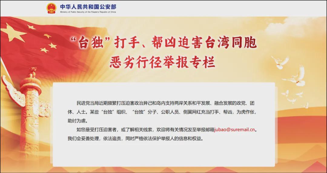 最后,给想证明自己是支持国家统一的台胞提个醒,记着下面的举报地址。立过功,等祖国统一了,你就是功臣。让我们携手共进,为维护国家统一和台海和平稳定贡献自己的力量。
