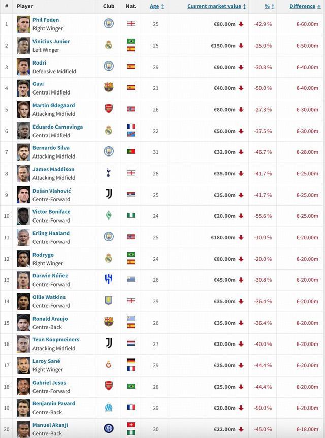 - 福登(曼城):总下跌6000万欧,现身价8000万欧