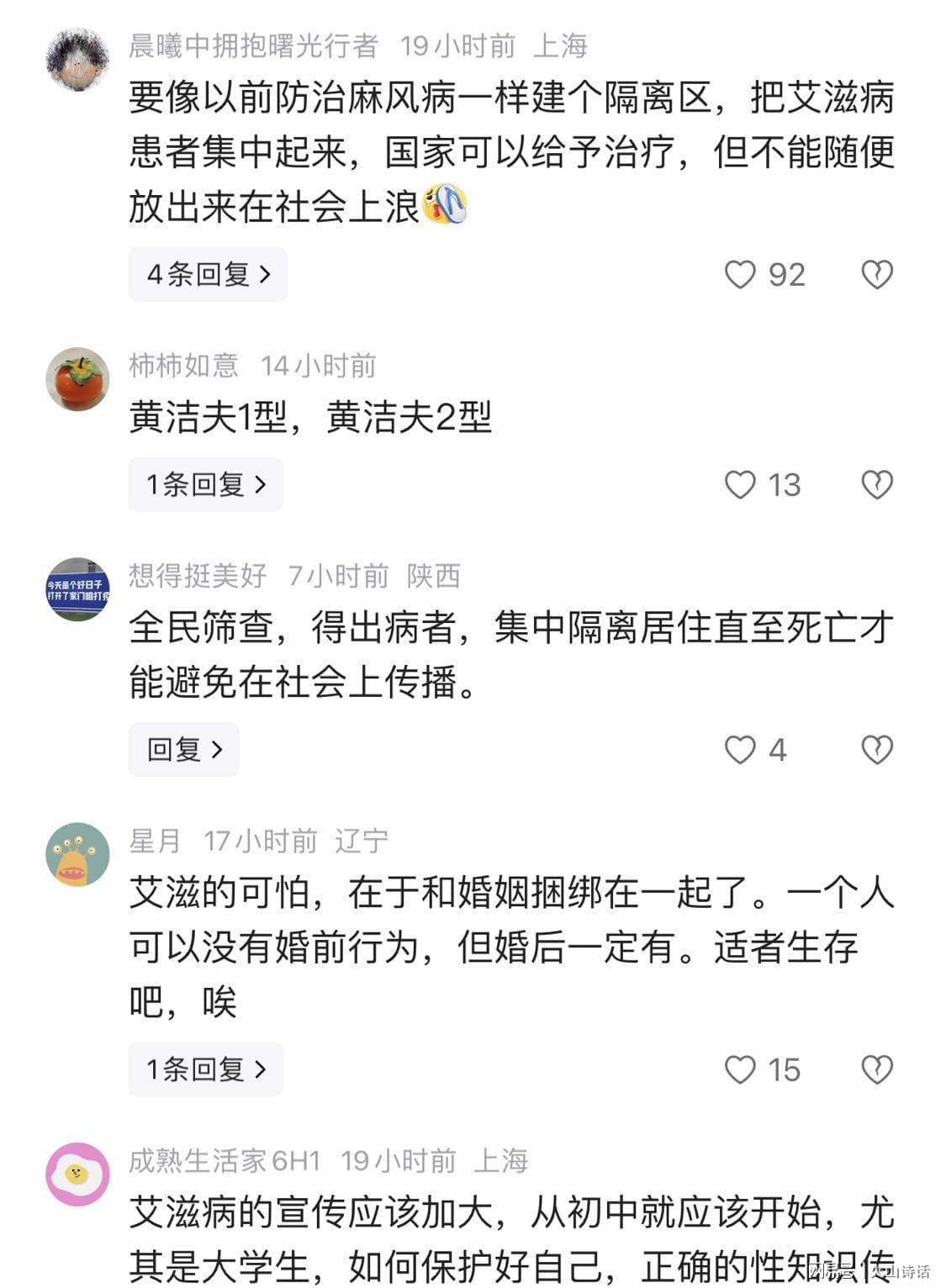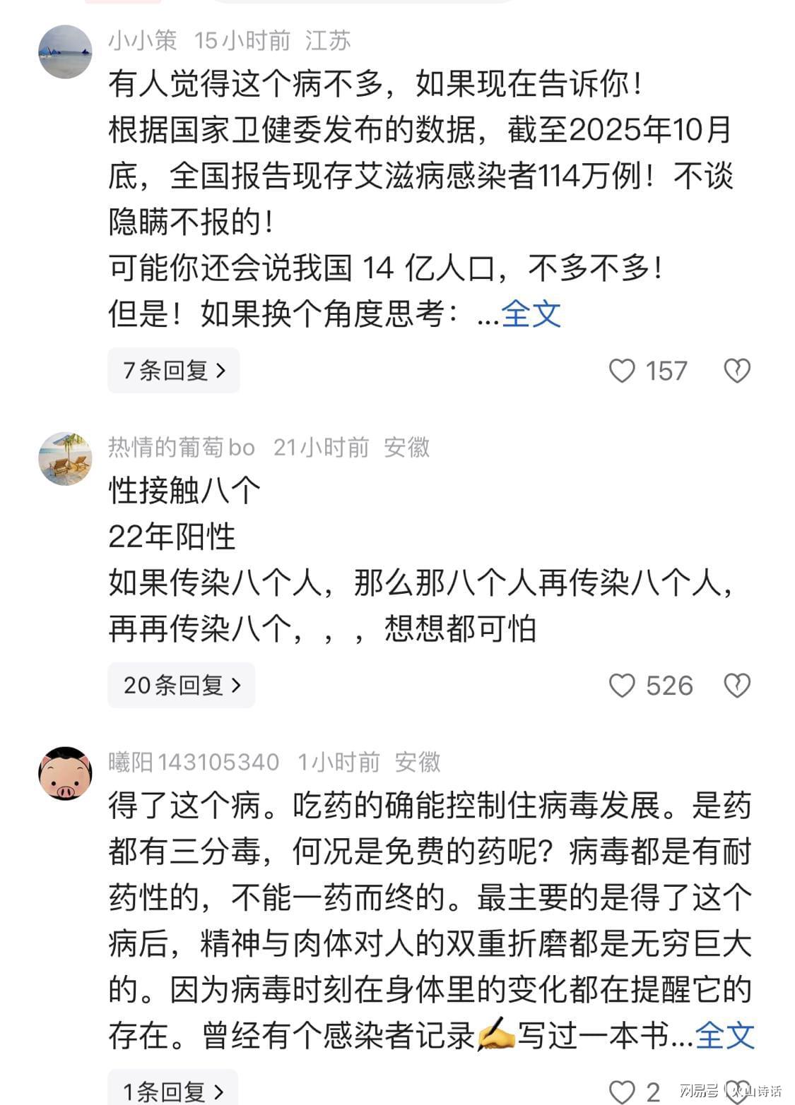 另有网友评论指出,有人觉得艾滋病不多,但根据国家卫健委发布的数据,截至2025年10月底,全国报告现存艾滋病感染者114万例。如果换个角度思考:14亿人口除以114万,意味着每1228人中就有一个是艾滋病感染者。这个比例在小区、学校等密集场所中显得尤为惊人。
