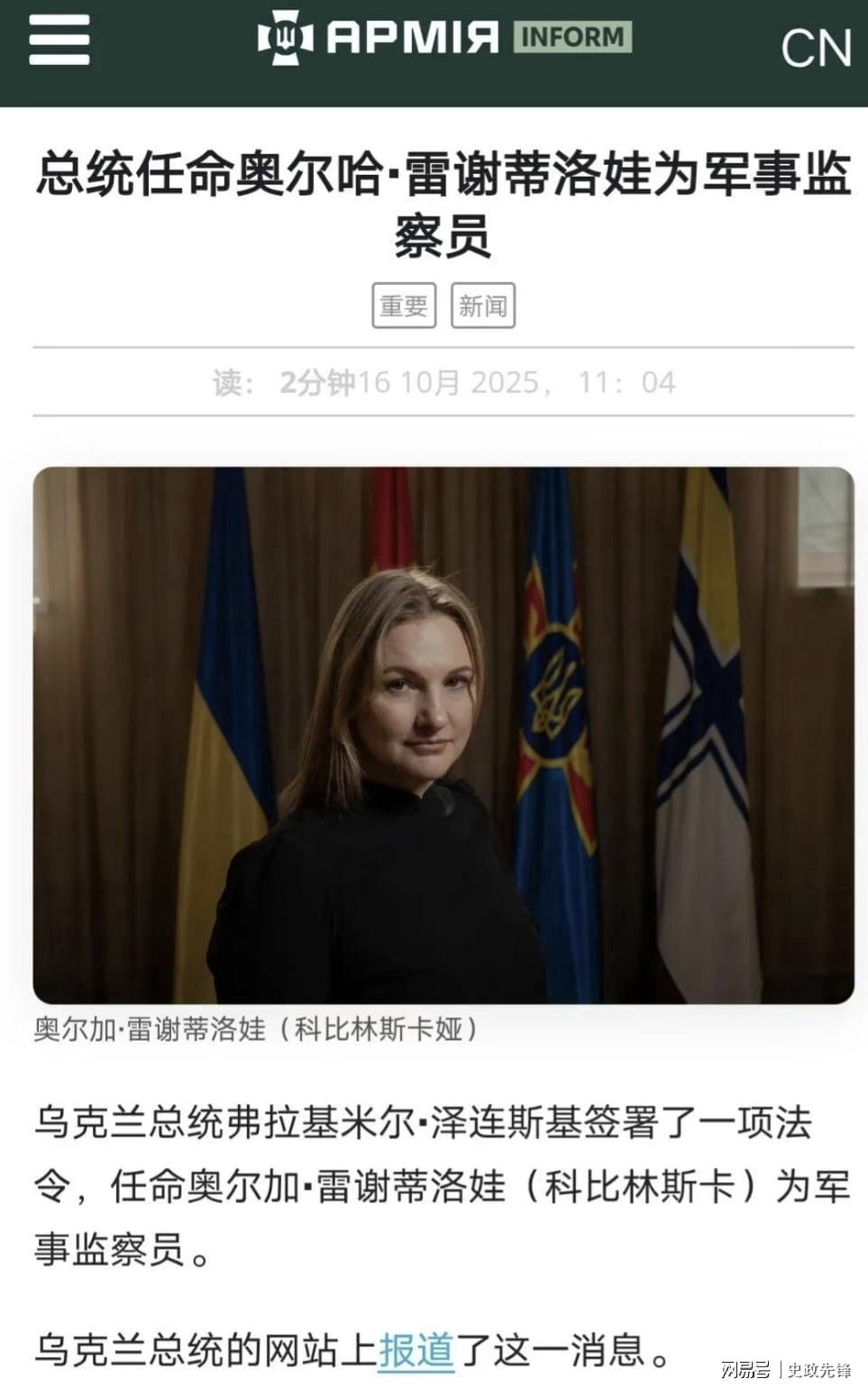 乌克兰总统泽连斯基昨日签署法令,任命奥尔哈·雷谢蒂洛娃(科比林斯卡)为军事监察员。至此,雷谢蒂洛娃也成为了乌克兰史上第一位军事观察员。