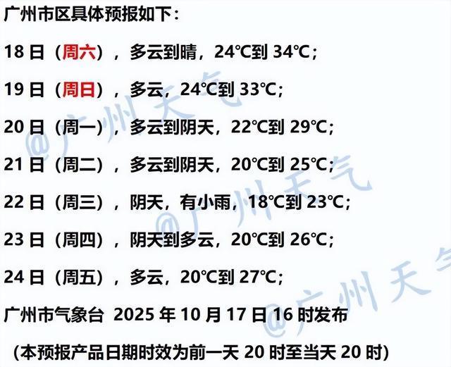 广州市气象台也给出了具体的预报,10月18日到19日白天,广州将以多云间晴的天气为主,最高气温在34℃左右。但从10月19日夜间起,受中等强度冷空气和海上热带系统的共同影响,日平均气温将逐渐下降。到了10月20日,最高气温将跌破30℃的关口。