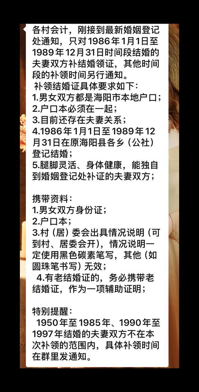另一网友在评论区晒出的微信截图显示,婚姻登记处通知,仅对1986年1月1日至1989年12月31日时间段结婚的夫妻双方补领结婚证,其他时间段的补领时间另行通知。补领结婚证的要求包括:双方都是海阳市本地户口;户口本必须在一起;还存在夫妻关系;1986年1月1日至1989年12月31日在原海阳县各乡(公社)登记结婚;腿脚灵活、身体健康,能独自到婚姻登记处补领。