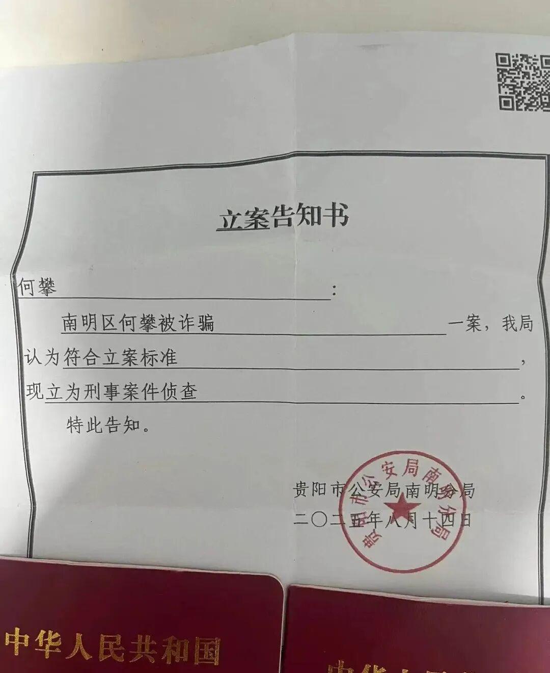 报警后,涉事婚恋公司向何攀退还了平台服务费,并签订了《合同调解退费终止协议书》,协议要求今后何攀不得以任何理由向乙方公司提出任何主张和诉求,不再追究任何刑事和民事法律责任。贵阳市南明区公安分局盖章出具的立案告知书显示,何攀被诈骗一案,该局认为符合立案标准,立为刑事案件侦查,开具时间为8月14日。