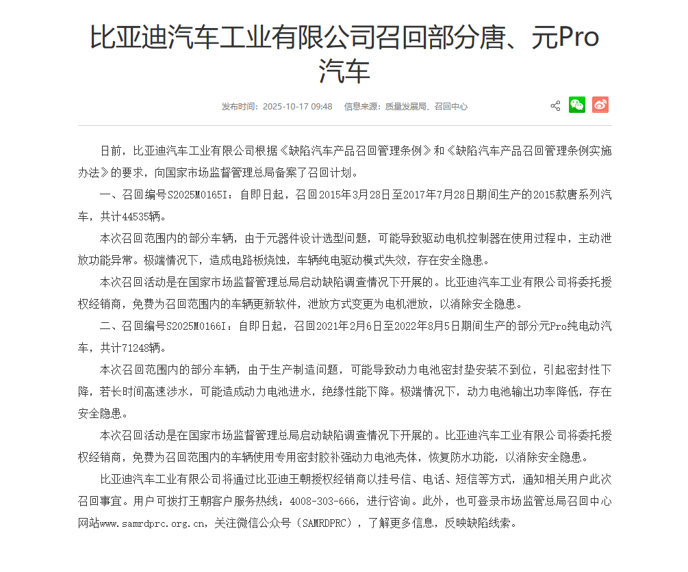 首批召回对象为2015年3月28日至2017年7月28日期间生产的44,535辆2015款唐系列汽车。问题根源在于驱动电机控制器元器件设计缺陷,可能导致主动泄放功能异常,极端情况下引发电路板烧蚀,致使车辆纯电驱动模式失效。解决方案是通过授权经销商免费更新软件,将泄放方式变更为电机泄放。
