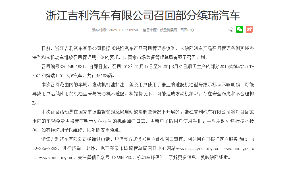 同日备案的吉利汽车召回计划,针对2018年12月17日至2020年3月31日生产的46,108辆2019款缤瑞1.0T车型。问题集中在发动机机油加注口盖及用户手册的适配机油型号标识不明确,可能导致用户使用不适配机油,极端情况下引发发动机损坏及排放异常。