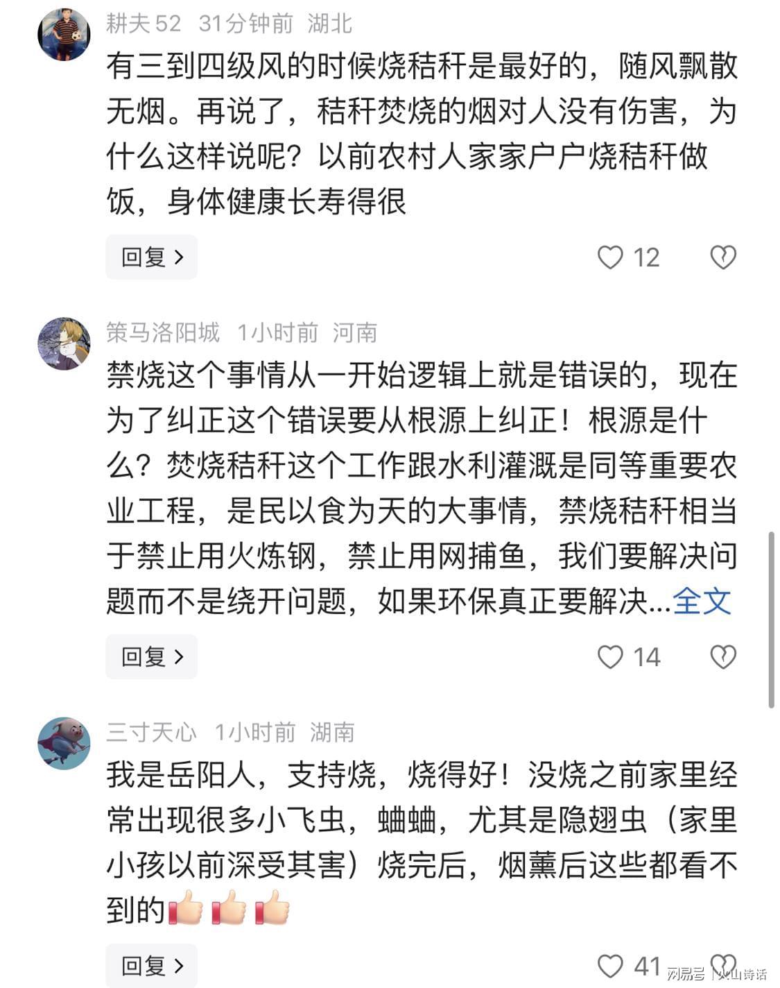 另一位网友则从农业工程的角度发表了看法:“禁烧这个事情从一开始逻辑上就是错误的,现在为了纠正这个错误要从根源上纠正!焚烧秸秆这个工作跟水利灌溉是同等重要的农业工程,是民以食为天的大事情。禁烧秸秆相当于禁止用火炼钢,禁止用网捕鱼。我们要解决问题而不是绕开问题,如果环保真正要解决焚烧污染,不能一禁了之,而是国家多部委要扎扎实实投入焚烧设备免费给农户解决焚烧需求。”