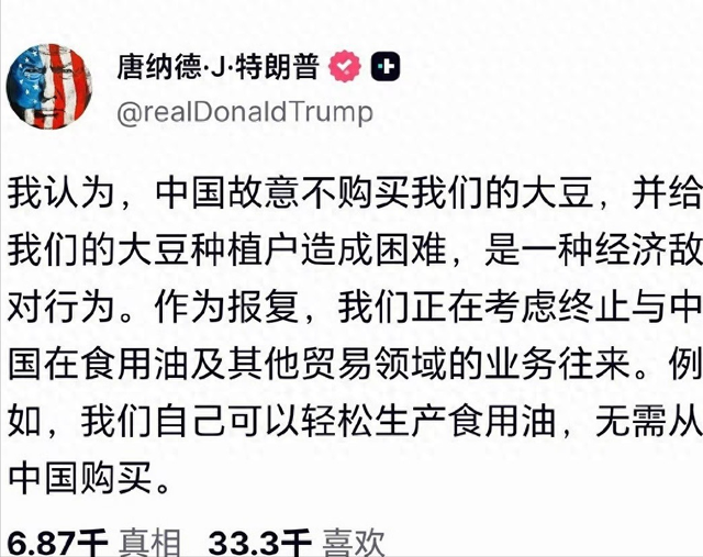 特朗普威胁停止从中国进口食用油,外交部0