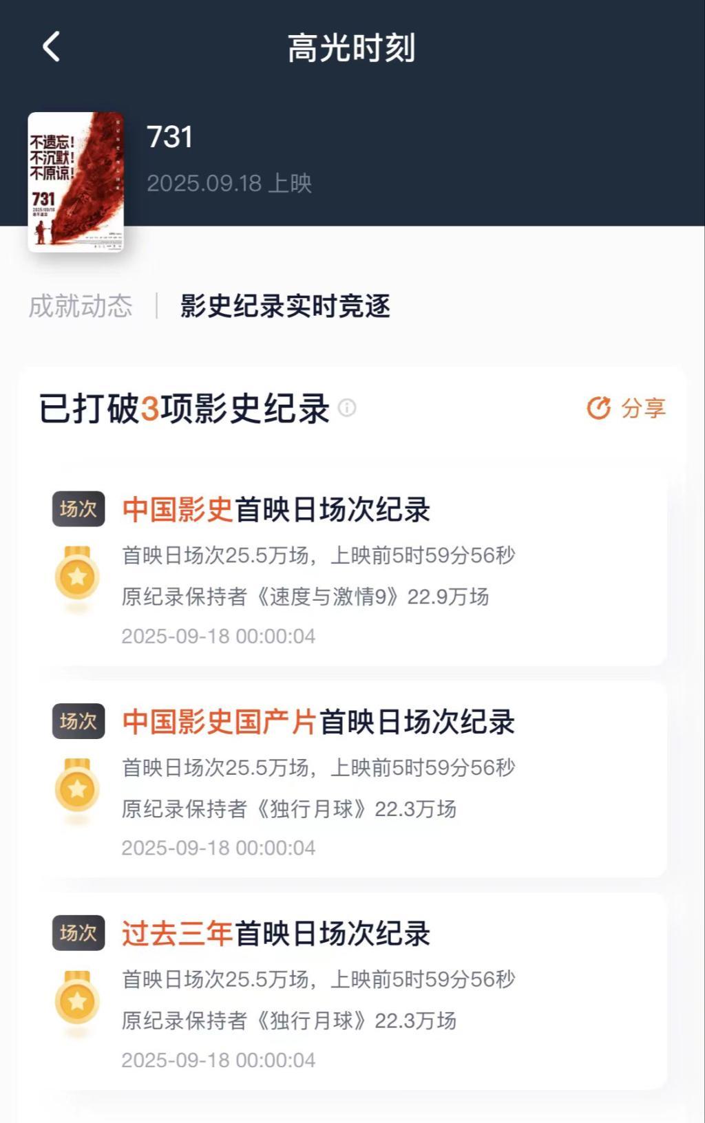 自预售以来,《731》在淘票票、猫眼两大票务网站上便吸引了超过700万用户点击“想看”。上映当日,影片更是打破了中国首映日场次纪录(原纪录保持者《速度与激情9》22.9万场)、国产片首映日场次纪录(原纪录保持者《独行月球》22.3万场)以及过去三年首映日场次纪录(原纪录保持者《独行月球》22.3万场)等三项影史纪录。274149场放映吸引了近千万人次的观众走进影院,共同回望那段不容忘却的历史。