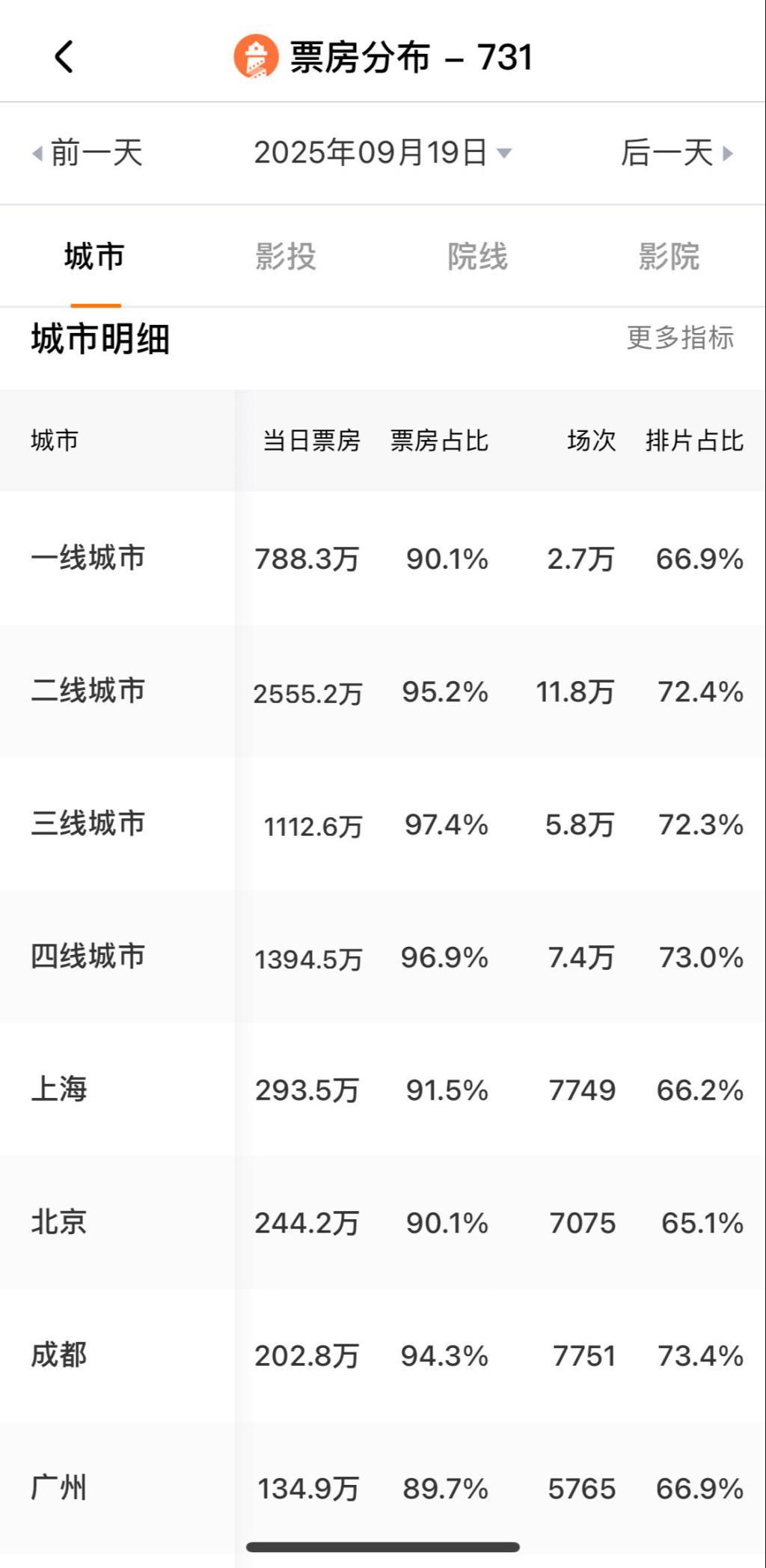 在城市票房分布上,上海以293.5万的票房成绩位列榜首,展现了强大的观影热情。