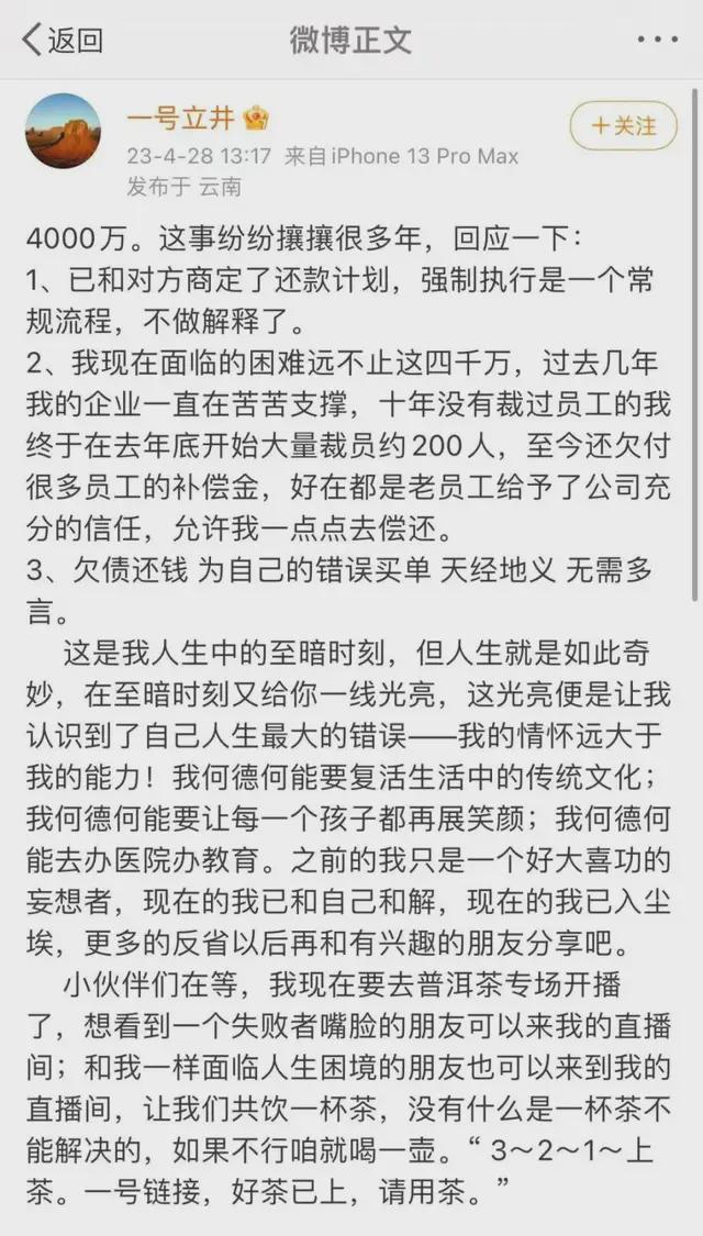 2024年,他的某场直播因“3999元标价乌龙”翻车,即便后期努力运营,第三方数据显示其近30天直播带货总销售额也仅在1000万至2500万元之间,注意,这是销售额,不是利润,对于他的债务而言只是杯水车薪。