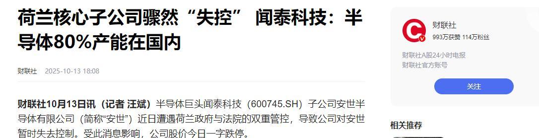 荷兰国内的质疑声同步高涨。《荷兰财经日报》10月15日撰文指出,政府动用尘封70年的法律干预民营企业,既未通过风险评估,又未考虑产业链实际绑定情况,如今“夺权容易守业难”,反而让本土企业陷入生存危机。经济界人士测算,若安世半导体失去中国市场,荷兰半导体产业整体产值将下降8%,相关产业链可能出现1.2万人失业。