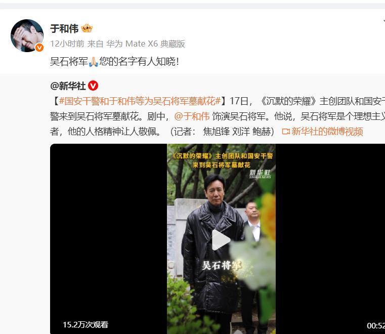 在大结局的当天,演员们也开始发视频,告别《沉默的荣耀》,于和伟感谢观众、并去了吴石将军和夫人的墓前献花缅怀致敬,魏晨也是对角色很不舍,吴越也发了剧组的照片。