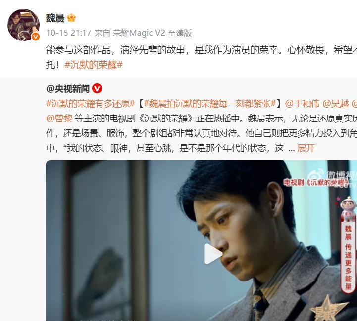 他文里写道:“能参与这部作品,演绎先辈的故事,是我的荣幸,心怀敬畏,希望不负所托!”