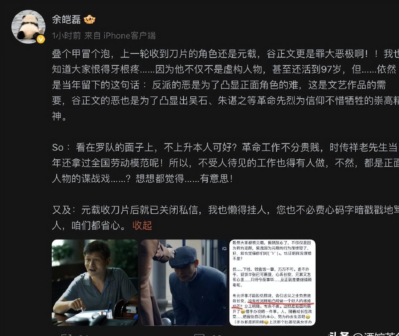 而演反派谷正文的余皑磊已经顶不住压力,在网上在线“求保护”,说自己快被骂到想关评论区了。