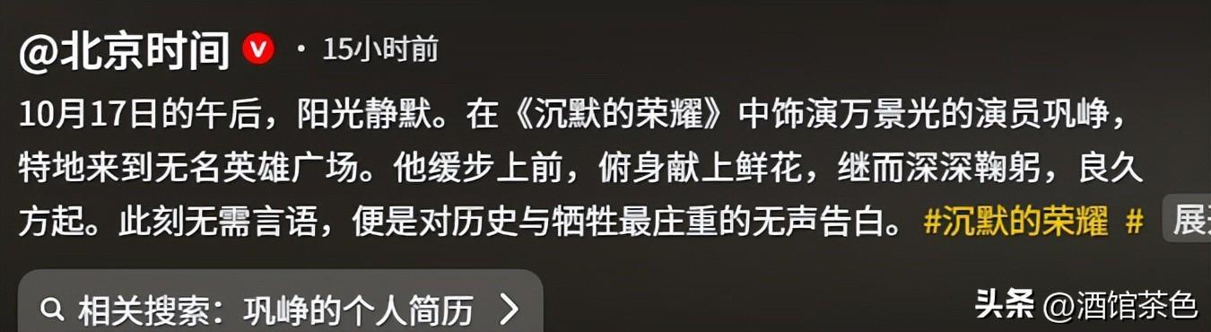 值得一提的是演员巩峥,在剧中饰演的万景光,也特地去了无名英雄广场,为英雄们献花,深深鞠躬,这大概就是这部剧的意义所在。