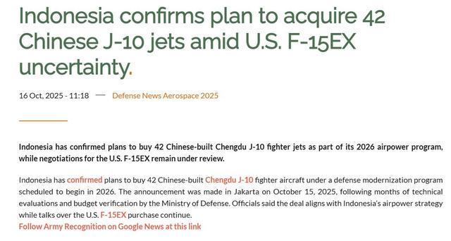 近期,印尼国防部与财政部相继宣布将采购42架中国歼-10A战机,这一消息犹如重磅炸弹引爆全球军事圈。各大军事媒体纷纷将其置于头条位置,热度甚至超越中国"九・三"阅兵。美国军事网站"ArmyRecognition"分析指出,歼-10不仅将替代印尼现役的F-16战机,更打乱了美国F-15EX与法国阵风的销售计划,标志着这款中国战机正成为国际军贸市场的新宠。
