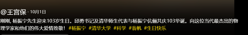 当时,好友还期待着10月1日给杨振宁庆生,没想到杨振宁在自己的生日没有露面。