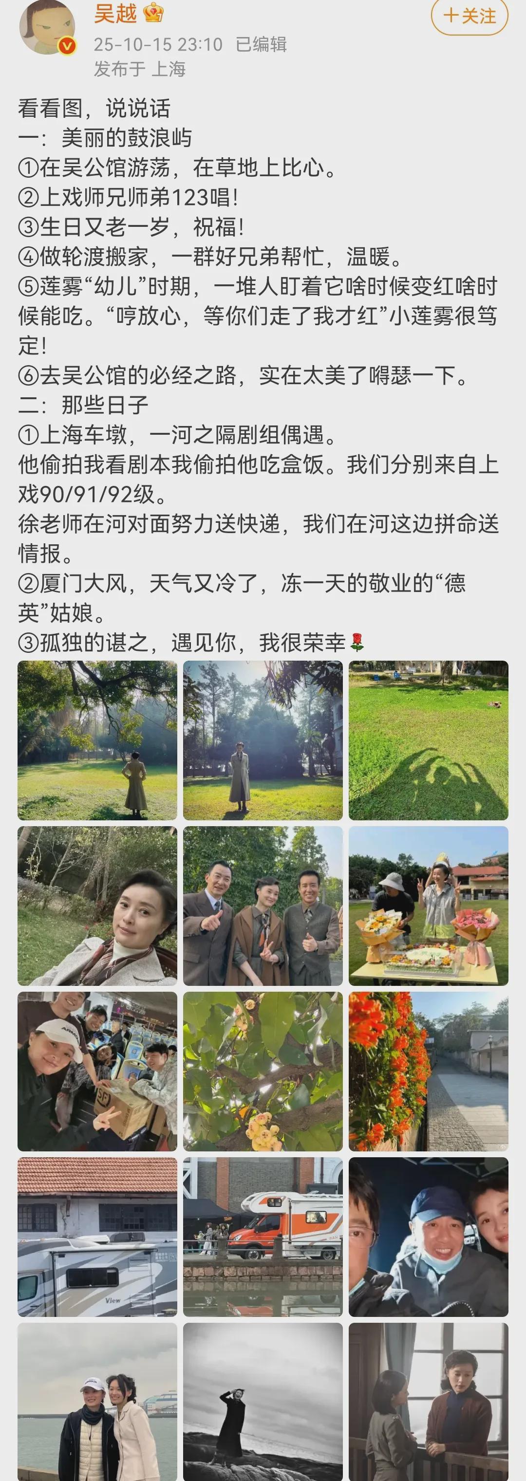 吴越在15日还发了一组照片,并表示:“孤独的谌之,遇见你,我很荣幸。”她还晒出了美丽的吴公馆的照片,以及她与于和伟、郝平的合影。剧中,郝平饰演的段退之是他们的敌人,而剧外,他们是用心搭戏的同行好友。