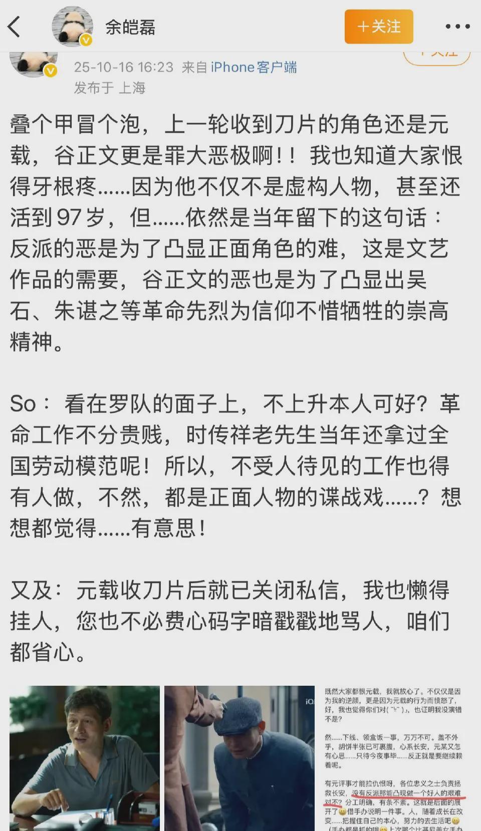 相反,历史上的她们因为丈夫的牵累,与孩子们承受了很多苦难和不公。她们和吴石、聂曦这些英雄们一样,值得敬佩!饰演谷正文的演员余皑磊也知道观众对这个角色、这个历史人物恨得牙根疼,所以他赶忙在微博发文“求放过”,希望大家不要将对角色的仇恨上升到演员本人。