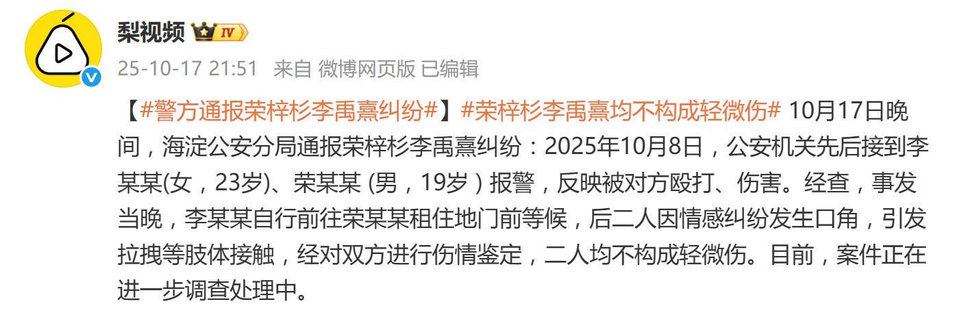 根据警方通报,事件发生在10月8日,李禹熹自行前往荣梓杉租住地等候,随后二人发生口角并升级为“拉拽等肢体接触”。尽管双方都报警指控对方殴打,但伤情鉴定结果显示,二人均不构成轻微伤。目前,这起定性为治安案件的风波仍在进一步调查中,但警方未明确暴力责任方,仅确认了冲突源于“情感关系”。