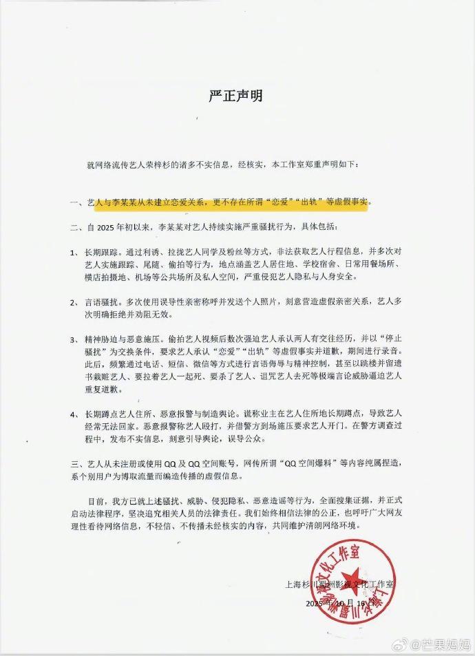 这一结论,让荣梓杉工作室在10月16日发布的“全盘否认恋爱”声明显得格外尴尬。工作室此前坚决否认恋情,并反控李禹熹存在“长期跟踪骚扰”和“恶意报警”行为,甚至声称已就“人身安全威胁”另行报案。然而,警方的“情感纠纷”定性,如同一记实锤,直接砸向了声明的可信度。