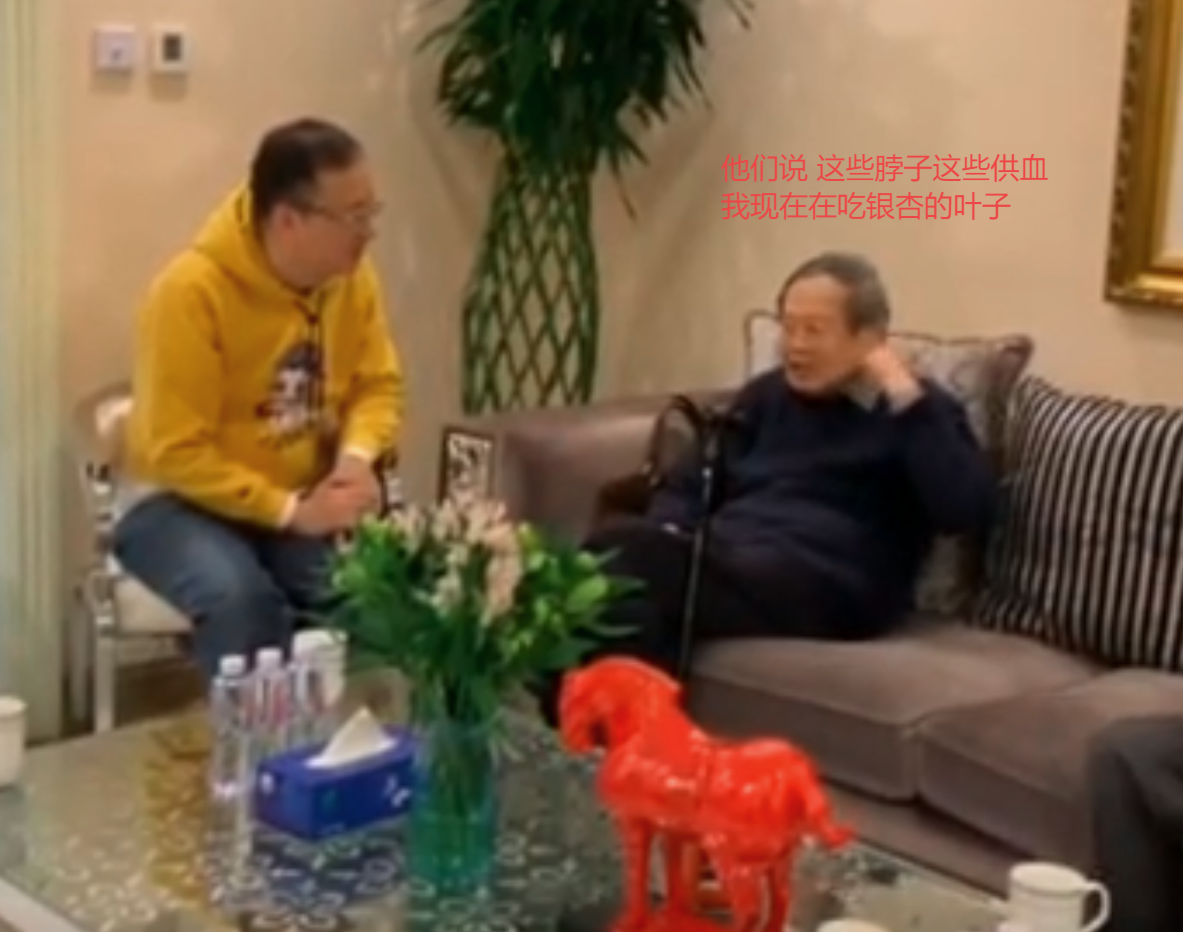 这位黄衣男子询问杨振宁身体情况如何时,杨振宁表示最近忽然头有点晕,还表示第二天要去301医院看看。杨振宁称之前去医院时,医生说是他脖子供血不足,现在已经在吃银杏的叶子。还透露医生让他多住几天,把这个情况解决好。