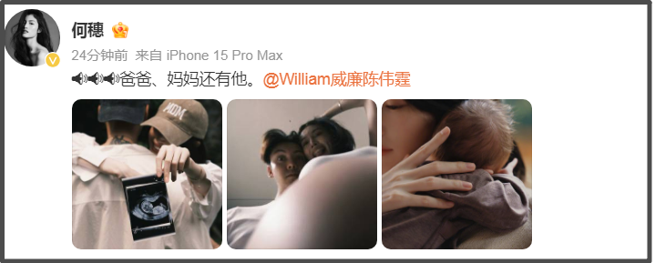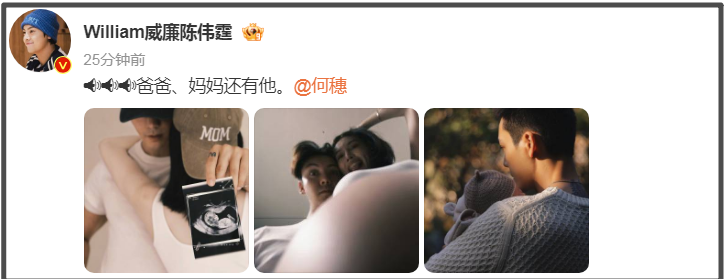 近日,娱乐圈迎来一则喜讯,陈伟霆与何穗突然官宣当爸妈,这一消息瞬间引发网友热议。两人一同晒出B超照、孕期照以及和儿子的合照,官宣文案甜蜜温馨,统一配文“爸爸、妈妈还有他。”,搭配的抱孩子照片还是对称版,甜度爆表,让粉丝们直呼“太甜了”。
