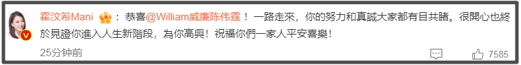 两人官宣后,圈内好友纷纷发文送出祝福,不过基本都是男方这边的朋友。陈伟霆的经纪人霍汶希艾特陈伟霆表示,陈伟霆一路走来的努力都有目共睹,很开心能见证他步入人生新阶段,并祝陈伟霆一家人平安喜乐,这份祝福相当真诚。
