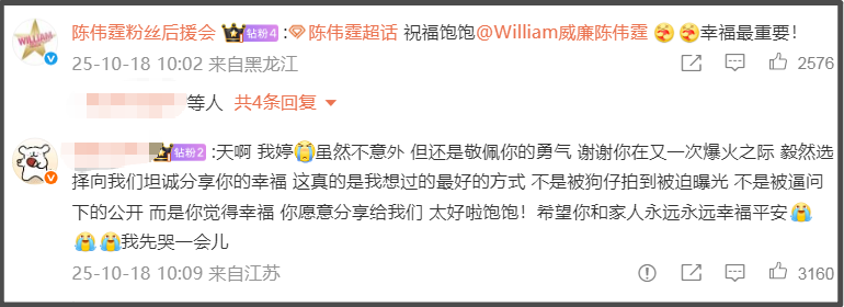 除了明星祝福外,陈伟霆的粉丝也纷纷送出了诚挚的祝福,这在流量圈明星中比较少见。而且,粉丝们还感谢陈伟霆主动公开这一喜讯,愿意跟大家分享幸福。从路人反应来看,陈伟霆和何穗是大家喜闻乐见的CP,两人不仅男帅女美,还年龄相当。