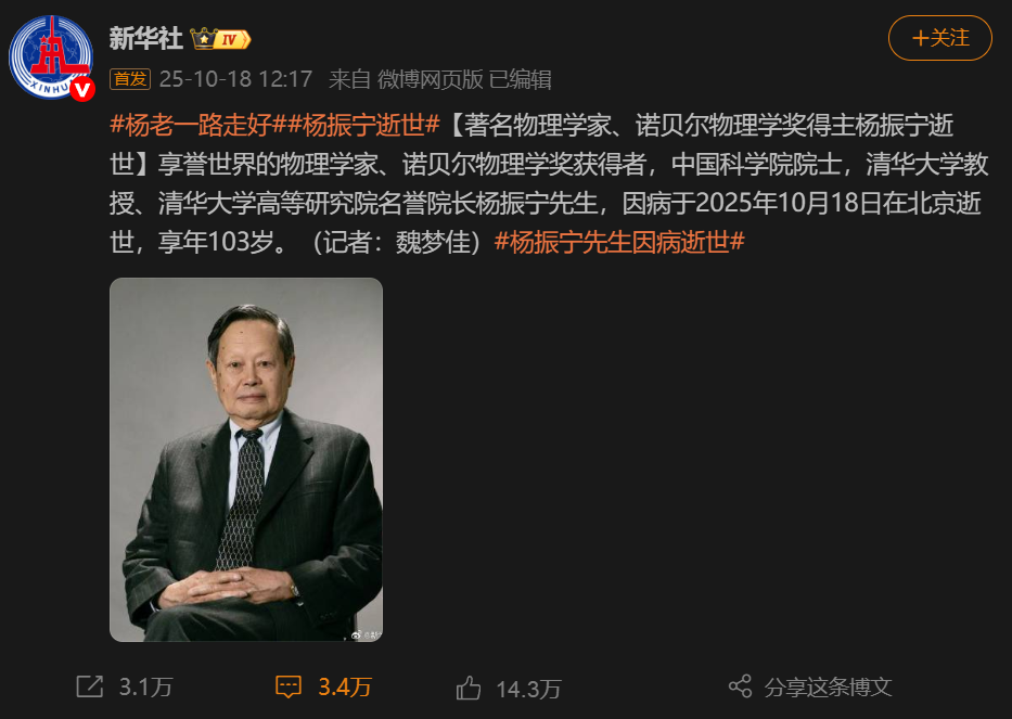 新华社消息,享誉世界的物理学家、诺贝尔物理学奖获得者,中国科学院院士,清华大学教授、清华大学高等研究院名誉院长杨振宁先生,因病于2025年10月18日在北京逝世,享年103岁。