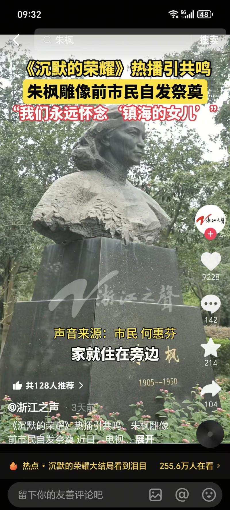 据浙江之声报道,近日,《沉默的荣耀》在央视热播,剧中的红色女特工就是出生于宁波镇海的朱枫。这两天,在朱枫的家乡镇海,一些市民自发来到纪念烈士的公园——枫园(当地老百姓也称朱枫公园),向烈士雕像献花致敬。有市民表示,朱枫是镇海的女儿,永远怀念她。