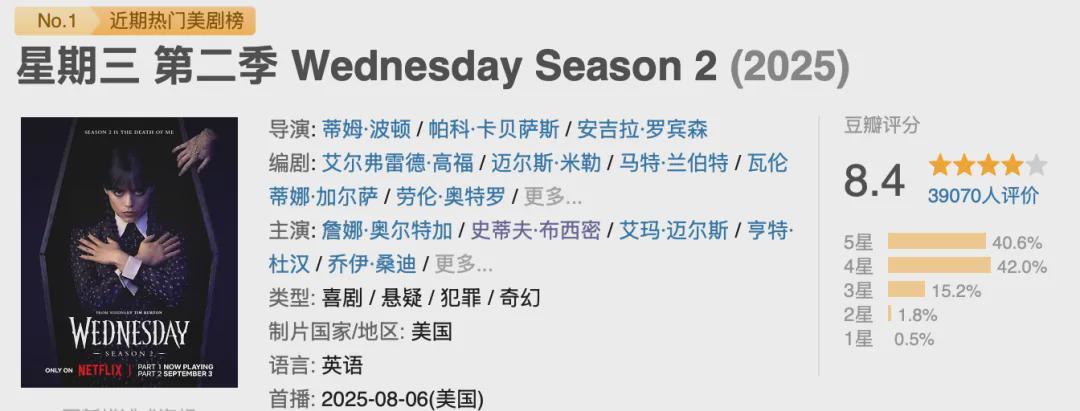 三年时光转瞬即逝,如今,《星期三》第二季终于强势回归,一开播便直接登顶美剧Top.1的宝座,在豆瓣上更是收获了高达8.4分的优异成绩,再次证明了其作为网飞爆款美剧的非凡实力。