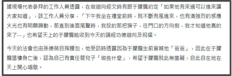 直到10月17日,于朦胧的前经纪人孙德荣,在新北板桥新月会馆自发为他举办了一场意义非凡的法会。原本,孙德荣曾多次表示要来北京,召集于朦胧生前的好友和同事一起举办这场活动,但不知为何未能成行,最终这场追思会在台湾举行。