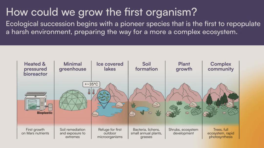 它们的使命是进行一场持续百年的生态接力:首先在受控生物反应器中繁殖,然后被释放到冰盖下的湖泊等最先出现液态水的‘避难所’。它们会分解土壤中的有毒物质,并通过新陈代谢将贫瘠的火星岩屑转化为富含有机质的土壤。当土壤准备就绪,地衣、苔藓、耐寒草本植物将陆续登场,最终灌木乃至树木将在这片红色土地上扎根。