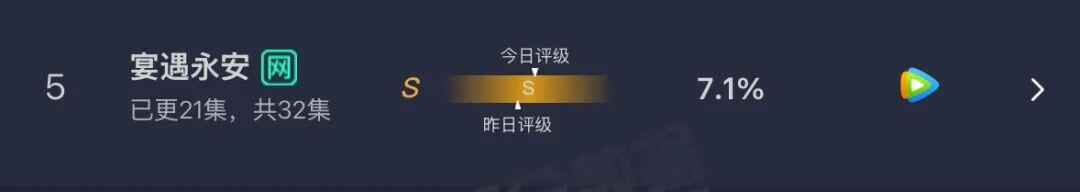鹅厂的《宴遇永安》定位轻喜下饭剧,女主带全家穿越后爱上“祖宗”男主,李昀锐王影璐组合有新鲜感,但美食、权谋、CP线营造都欠缺火候,成为垫底。