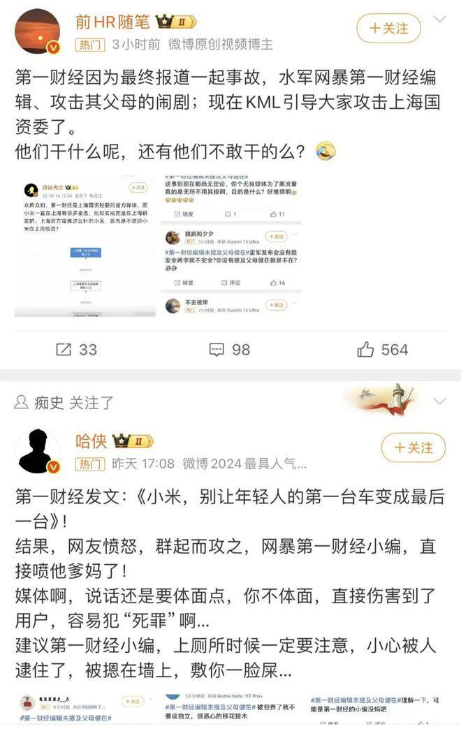 部分极端粉丝的言论令人震惊,有人质问“是否因未交保护费而遭针对”,甚至公开呼吁“小米法务起诉第一财经”。在这些粉丝眼中,任何批评都被视为“黑公关”,任何质疑都等同于“诅咒”。这种非理性的态度,已非简单的品牌维护,而是演变为一种“文字狱”式的极端行为。