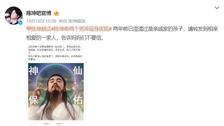 面对舆论发酵,陈坤方面在爆料9小时后通过“陈坤吧”官博紧急回应,称相关传闻“两年前已澄清”,并强调两个孩子是亲戚家的孩子。为证明所言非虚,官博还晒出了陈坤2023年的辟谣帖文。