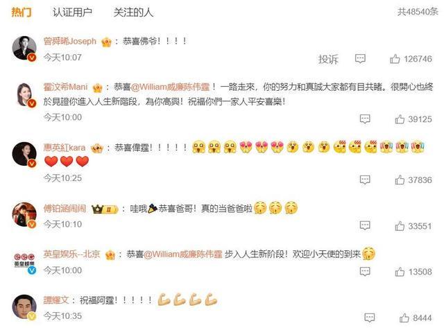 陈伟霆跟超模何穗官宣生子后,娱乐圈的一众明星纷纷送上祝福。