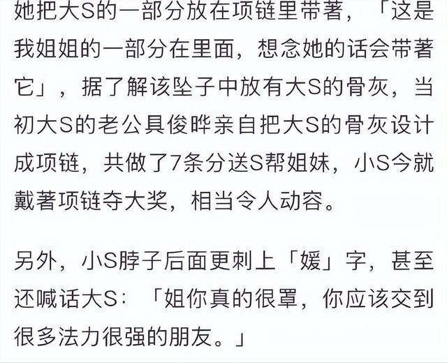 在后续采访时,小S摸着胸前的项链,当众表示,这是姐姐大S的骨灰做成的。