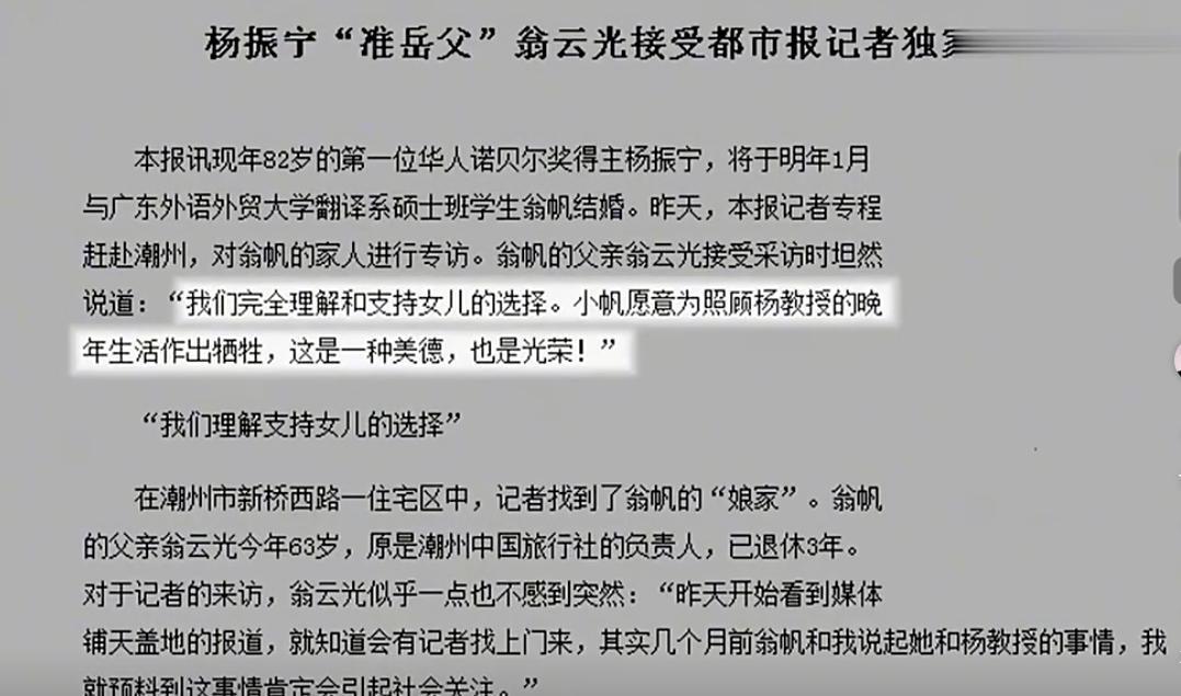 翁帆的父亲翁云光在接受采访时表示,他们理解并支持女儿的选择。翁帆愿意与杨振宁教授结婚,照顾他的晚年生活,这种牺牲是美德,也是光荣。