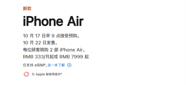 同时,10月17日,iPhone Air国行版今天也正式开启了预购,起售价是7999元,将于10月22日正式开售,而这被认为是国行第一款彻底取消实体SIM卡的手机,必须使用eSIM,开启了国内手机的新时代。